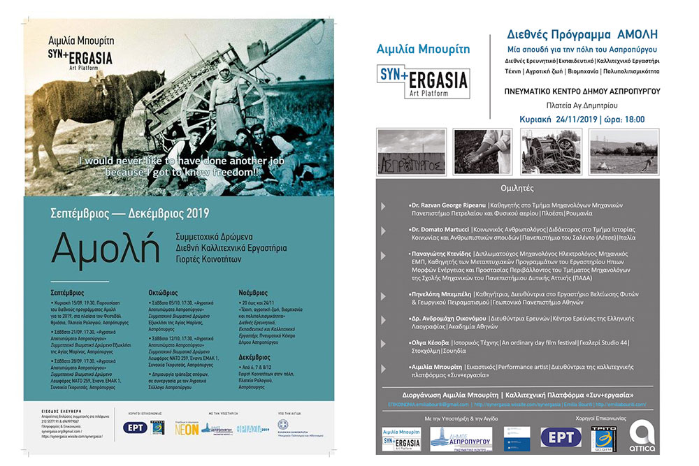 Η ομάδα έργου Συν+εργασία μέσα σε ένα πρόγραμμα φιλοξενίας διοργανώνει ένα διεθνές ερευνητικό εργαστήρι με σκοπό τη συνεργασία ερευνητών από το χώρο της επιστήμης, της εκπαίδευσης και των τεχνών με σκοπό τη γνωριμία τους με την πόλη του Ασπροπύργου. Οι ερευνητές θα μελετήσουν την ιστορία, το ανθρώπινο δυναμικό, τη φυσιογνωμία του τοπίου, τη βιομηχανική και μεταβιομηχανική και την αγροτική της υπόσταση της πόλης καθώς και την πολυπολιτισμική της κοινωνία.