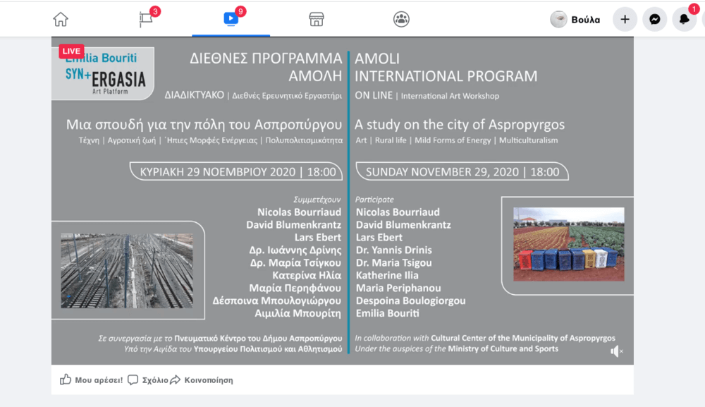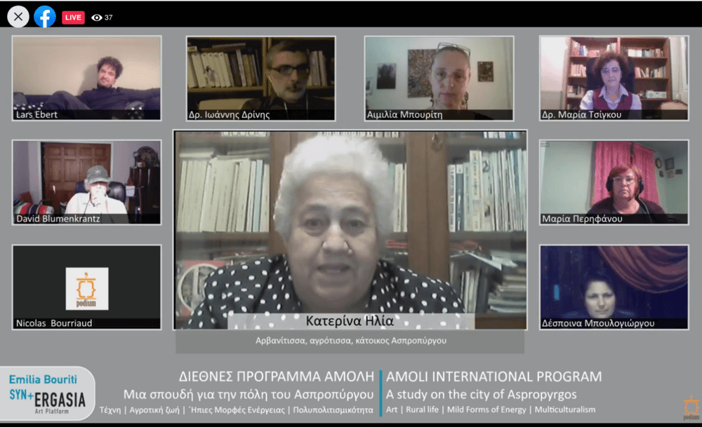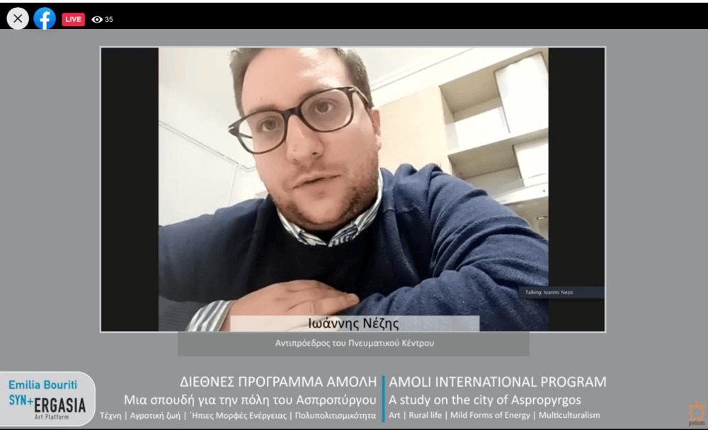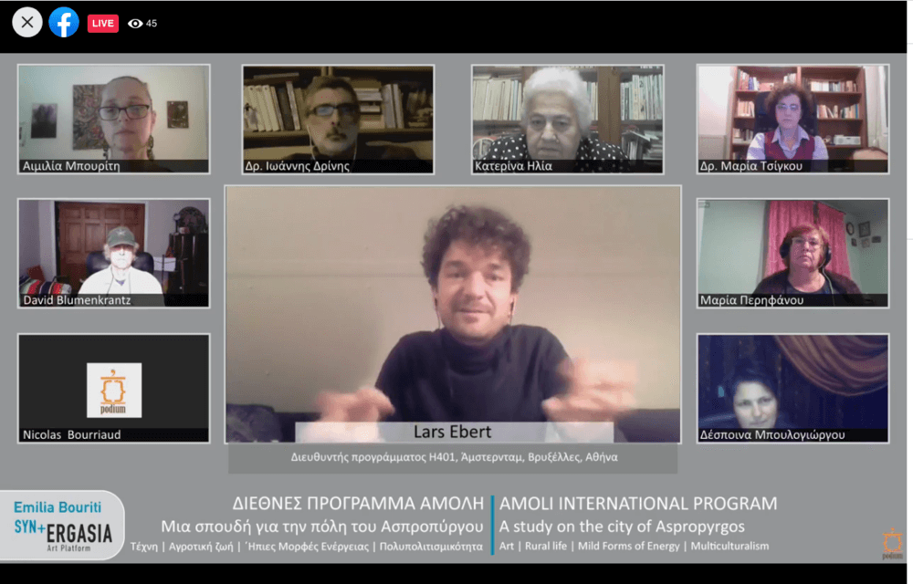 Ένα διεθνές ερευνητικό, εκπαιδευτικό, καλλιτεχνικό εργαστήρι με τίτλο «Μια σπουδή για την πόλη του Ασπροπύργου» πραγματοποιείται με τη συμμετοχή προσωπικοτήτων από την Ελλάδα και το εξωτερικό, από την Αιμιλία Μπουρίτη, σε συνεργασία με το Πνευματικό Κέντρο του Δήμου Ασπροπύργου, στο πλαίσιο του διεθνούς προγράμματος ΑΜΟΛΗ και με την υποστήριξη και την αιγίδα του Υπουργείου Πολιτισμού και Αθλητισμού, την Κυριακή 29 Νοεμβρίου, στις 18.00, με διαδικτυακό τρόπο, απόλυτα προσαρμοσμένο στις συνθήκες που έχει προκαλέσει η πανδημία του covid- 19.