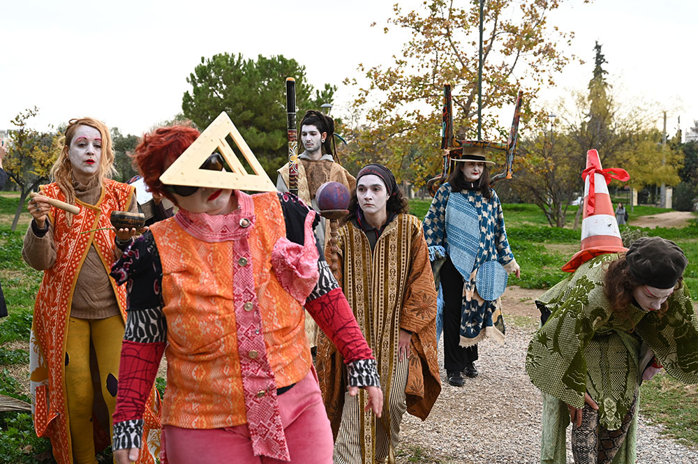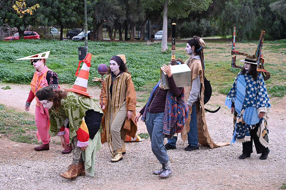A wandering troupe searches for the ruins of its lost art in the images of the landscape. It converses with the roots of the trees and the grooves of the rain. It focuses on the horizon, beyond logic, and perceives the world beneath the ground, beneath human feet. As a collective body, it condenses and expands, is carried away and resists, comments and expresses. Like a priesthood of a non-human religion observing the microcosm of the park. Without judging or condemning, it listens to life and history.