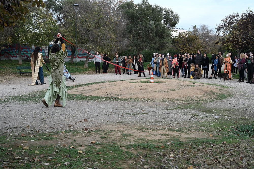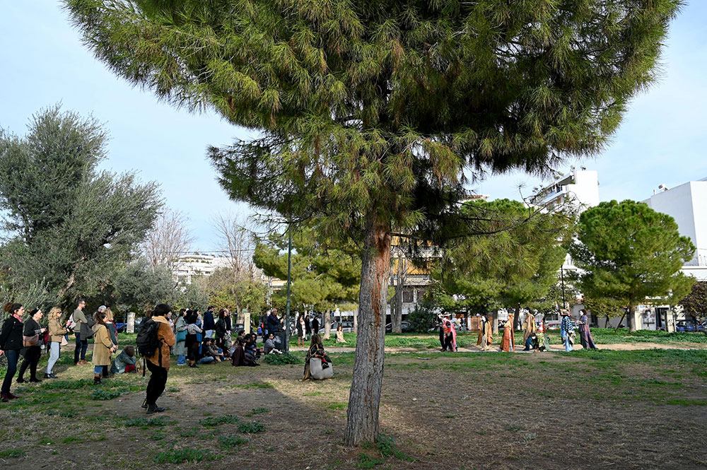 Although the nature of the forest, the incomprehensible politics of its flora and fauna, does not align with the spirit of the times that demands things to be perfect, flattened, and utilitarian, the performance “aSYmmetro edaFOS” invites us to experience the value of the environment. Walking through the park, among some of Athens’ most important historical monuments, we open our senses and bodily-instinctive abilities to experience collectivity and interaction as a state of being.