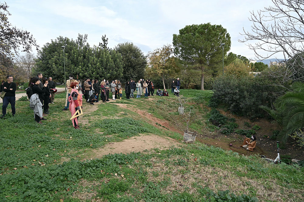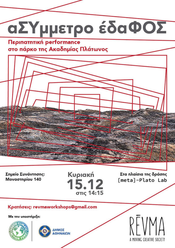The performance aSYMmetric grouND is a multisensory walking performance created by the participants of the meta-Plato Lab workshop, with themes: The body as part of the natural landscape / Curvature in relation to linear progression. The performance is a work in progress and part of the meta-Plato Lab initiative, a research on the sustainability of the Park of Akadimia Platonos.