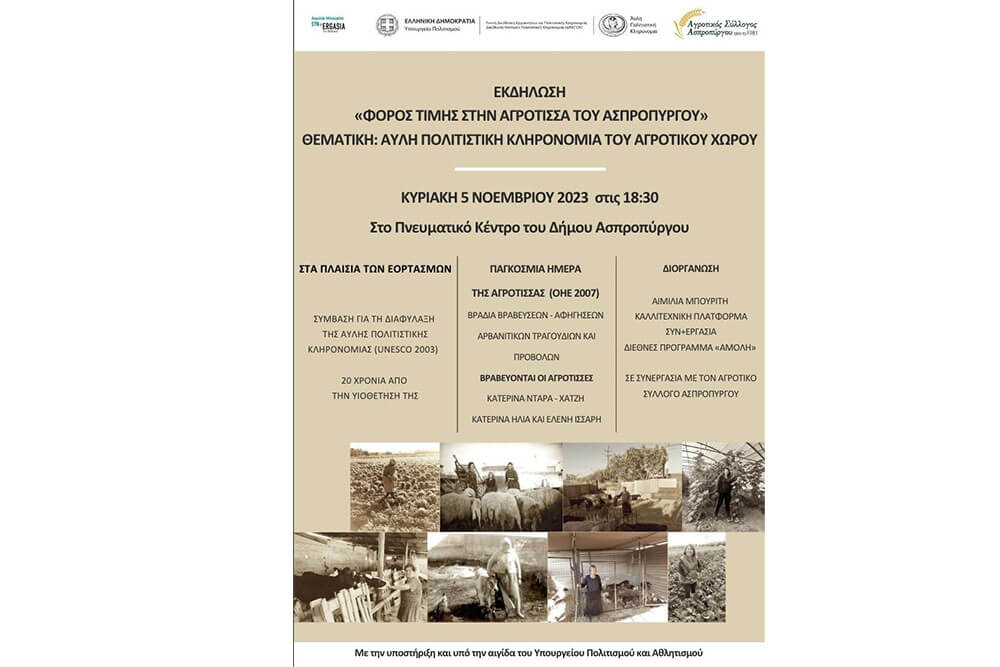 As part of the 20th anniversary of the adoption of the Convention for the Safeguarding of the Intangible Cultural Heritage (UNESCO 2003), a tribute event will be held on Sunday, November 5, 2023, at 18:30 in Aspropyrgos, honoring the local female farmer and her role in both the development and preservation of Aspropyrgos’ cultural heritage. This is a region that, despite its post-industrial character, still maintains a strong agricultural identity—something not widely known.